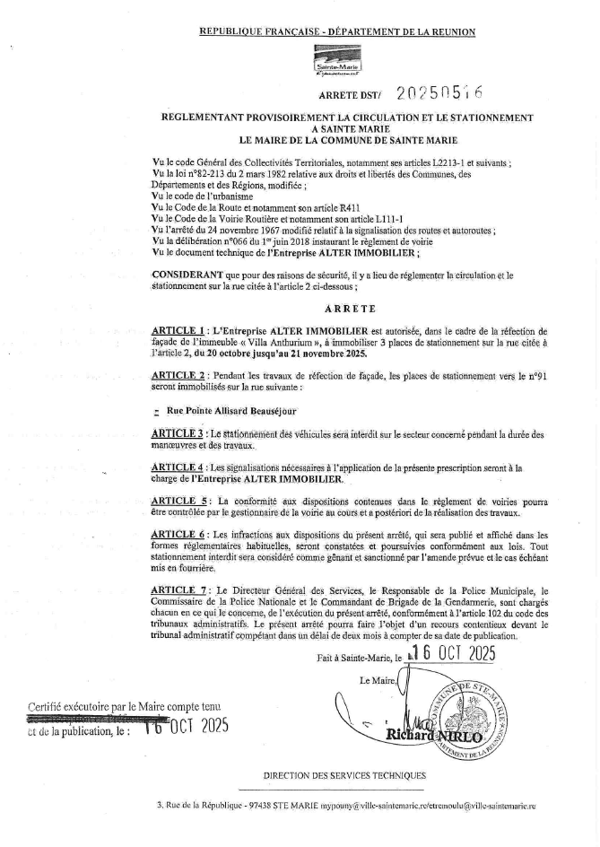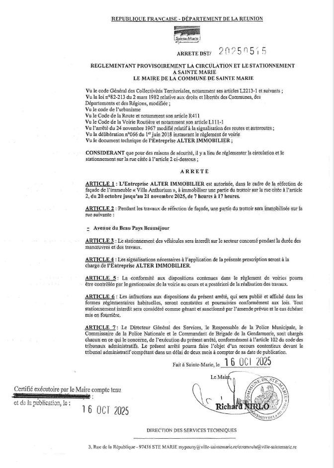 Dans le cadre de travaux de réfection de façade de l'immeuble "villa anthurium", l'entreprise Alter Immobilier est autorisée à immobiliser 3 places de parking vers le n°91 rue Pointe Allisard Beauséjour.