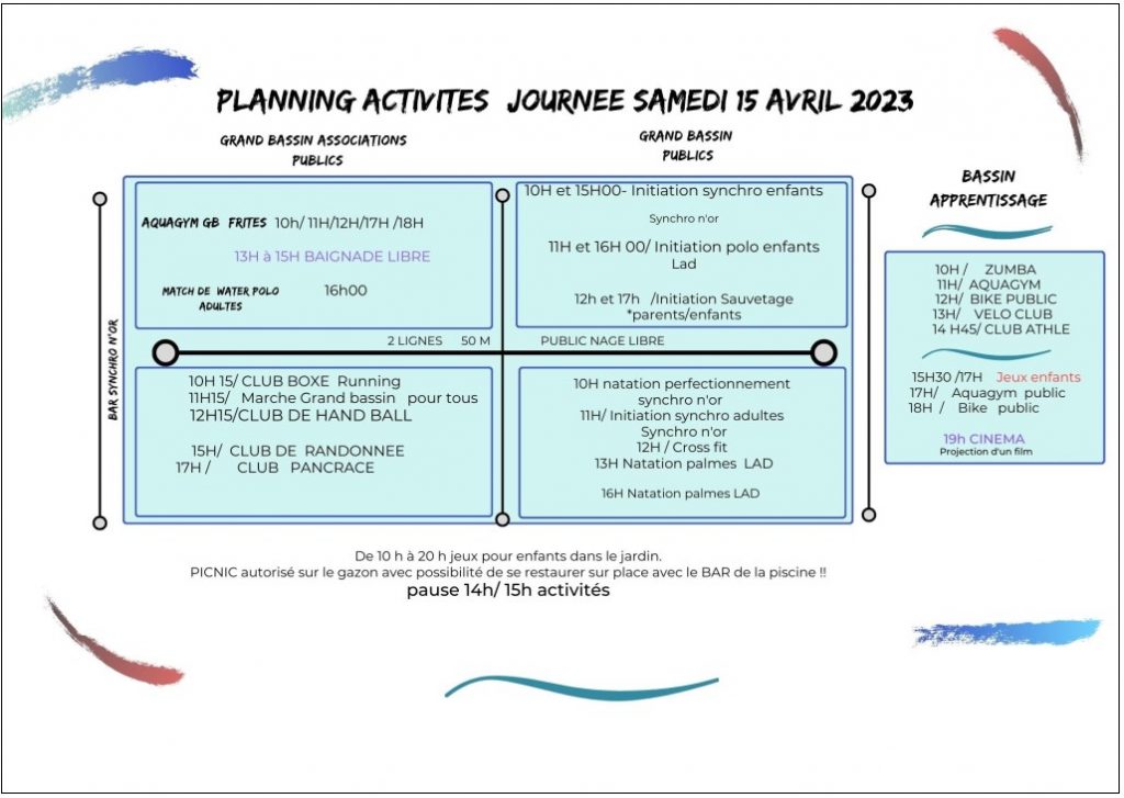 Au programme : aquagym, aqua-bike, initiation waterpolo, sauvetage etc.. mais également des expositions culturelles ainsi que la projection d’un documentaire.