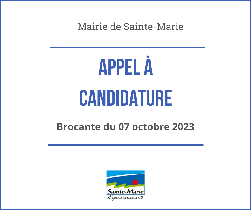 La ville de Sainte-Marie lance un appel à candidature en vue de l’exploitation d’emplacements pour la brocante du 7 octobre 2023, sur le parking de la Mairie du Centre-ville.