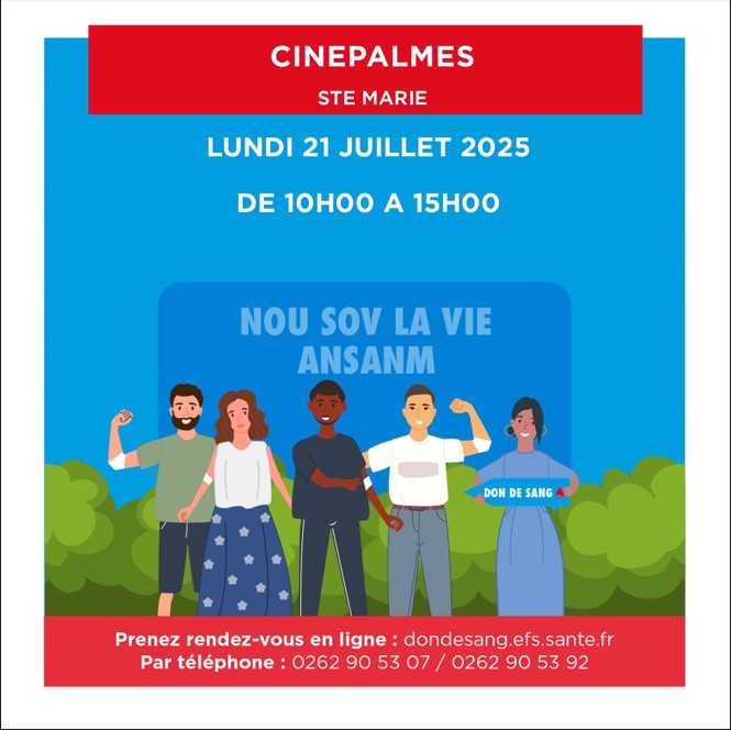 Je me permets de vous contacter afin de solliciter votre soutien dans le cadre de la promotion de collecte de sang organisée ce lundi 21 juillet au CINEPALMES DE STE MARIE. Il nous reste encore 32 places disponibles. Nous lançons un appel à la mobilisation de l’ensemble du grand public de la zone !