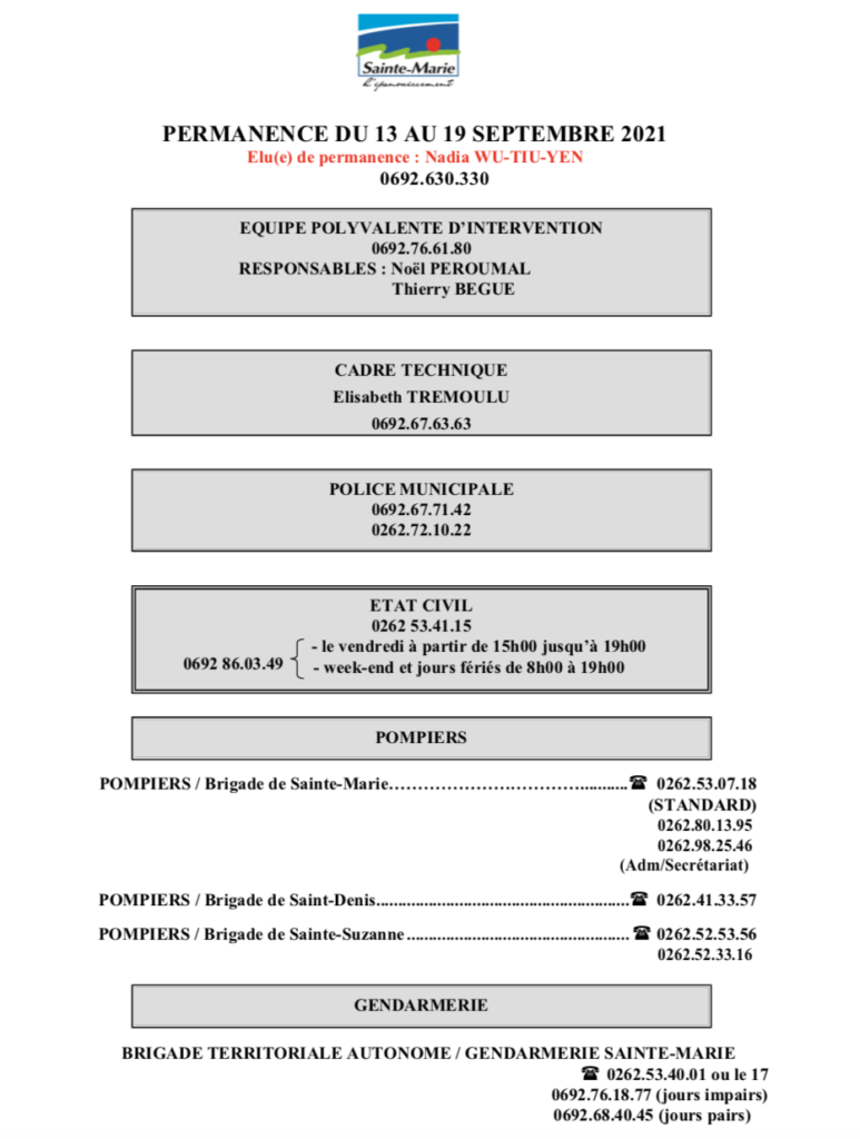 Lun-jeudi : 8h00/16h00infomairie@ville-saintemarie.re02 62 53 41 15