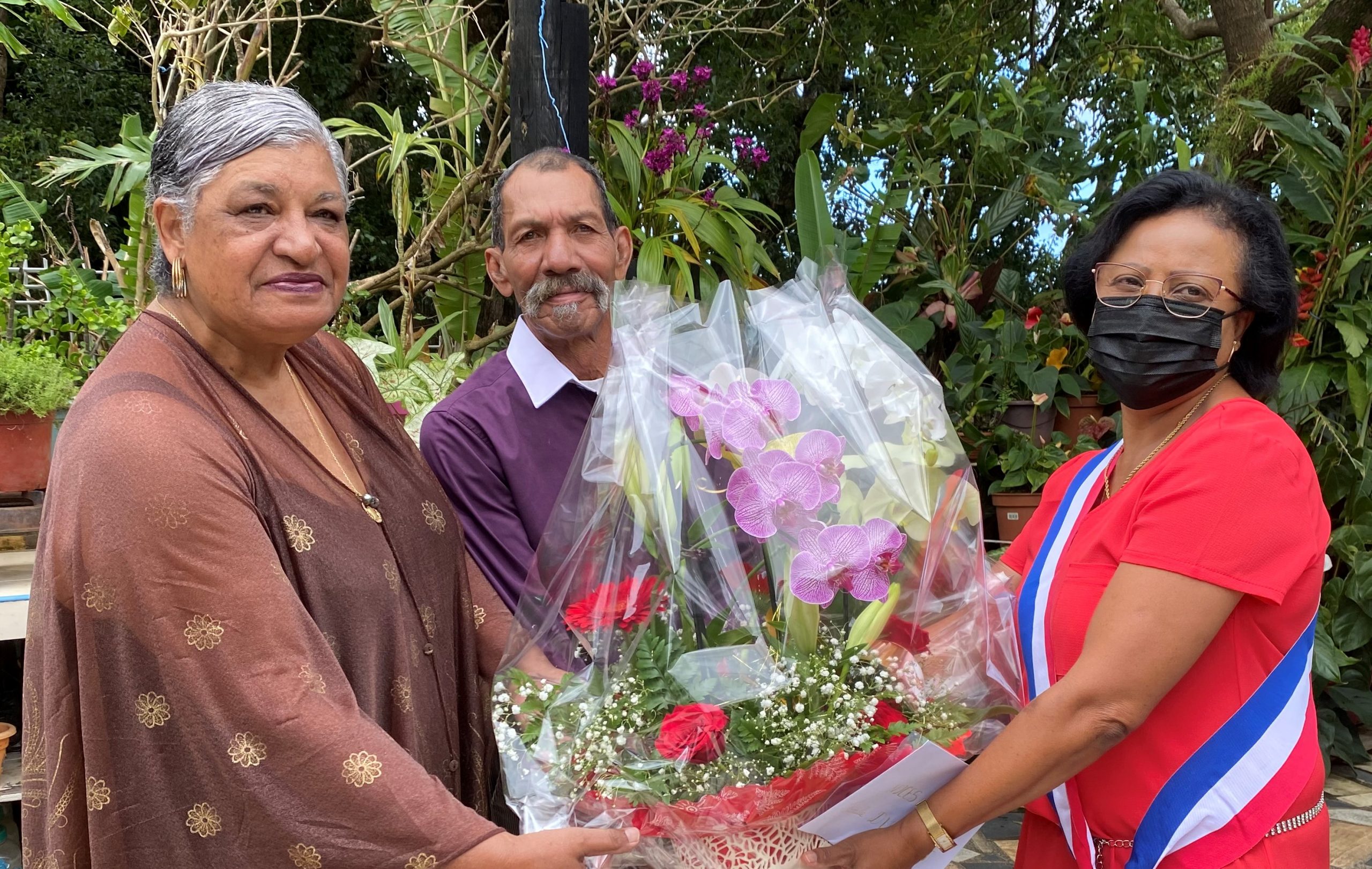 Marie-Line Soubadou, 3ème Adjointe au Maire de Sainte Marie, Myrielle Hivanhoe, Conseillère municipale et Matthias Dassot, membre du Conseil d’administration du CCAS de Sainte Marie, ont honoré le couple pour leurs 50 ans de vie commune.