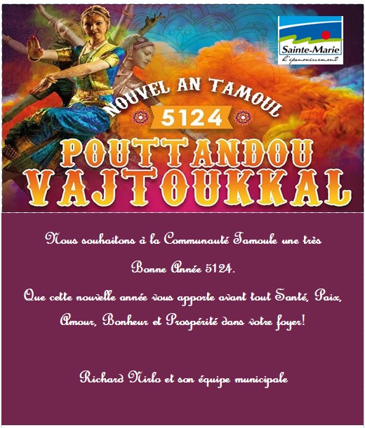 14/04/202314/04/2023Pouttandou Vajtourkkal 5124!!!!Dans Actualités municipalesLe Maire et les élu(e)s du Conseil Municipal de Sainte-Marie souhaitent à la communauté Tamoule une très « Bonne Année 5124 »!!Qu’elle soit messagère de réussite, de bonheur et de paix.