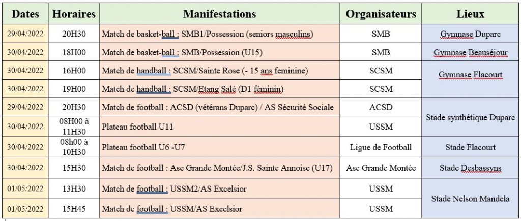 Toutes les rencontres sportives à Sainte-Marie du 29 avril au 1er mai 2022.