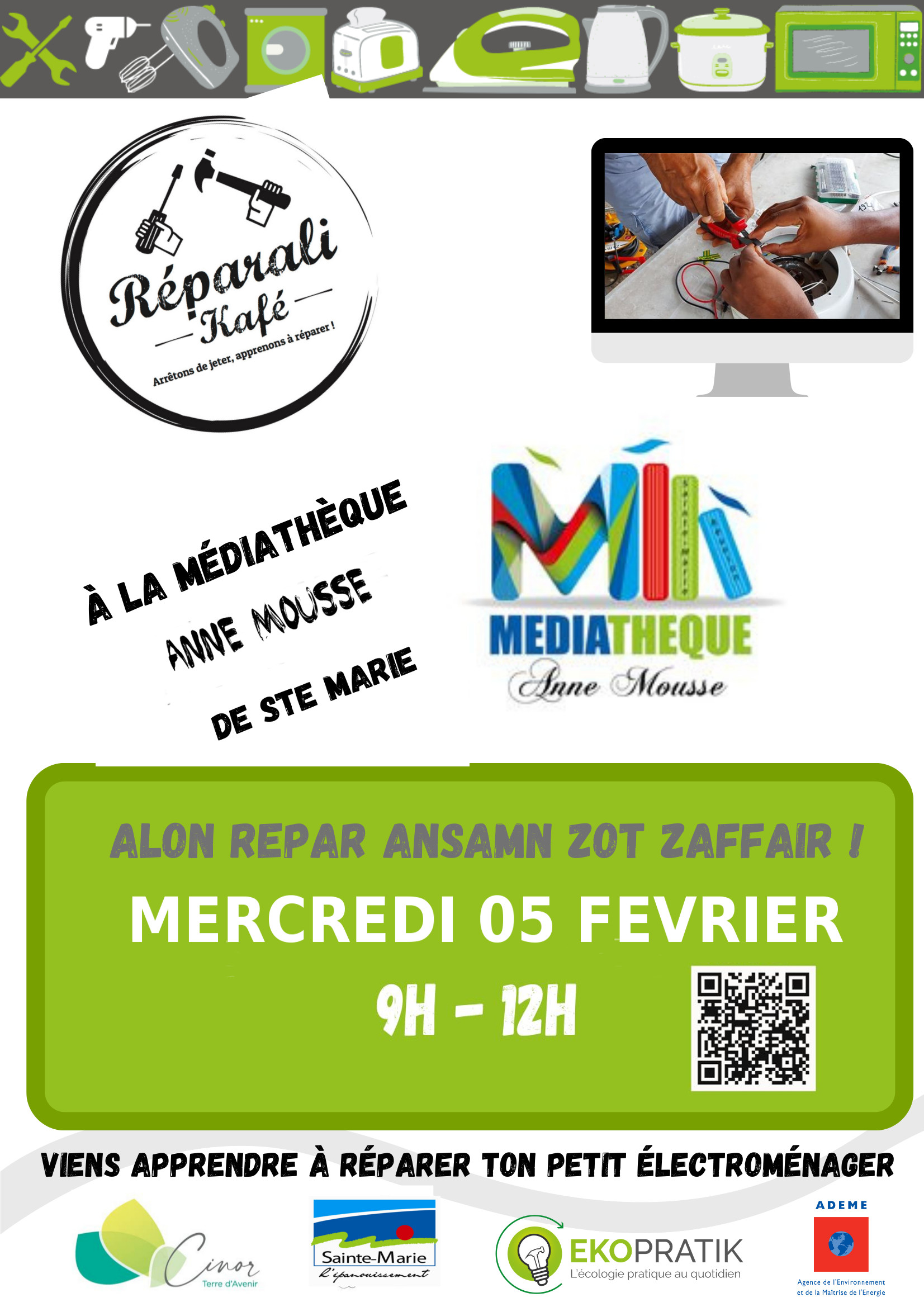 L’équipe du Réparali Kafé vous donne rendez-vous le mercredi 05 Février de 9h à 12h à la Médiathèque Anne Mousse de Sainte-Marie pour vous aider à réparer votre petit électroménager.